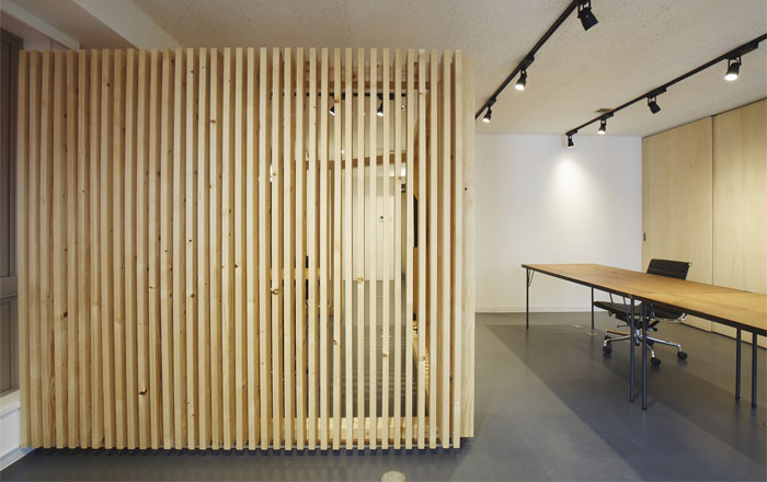 既存のオフィスビルの一室をリノベーション。限られたスペースに箱状のルーバーを配置することで空間を分け、それぞれに居心地のよいオフィス空間を作った。