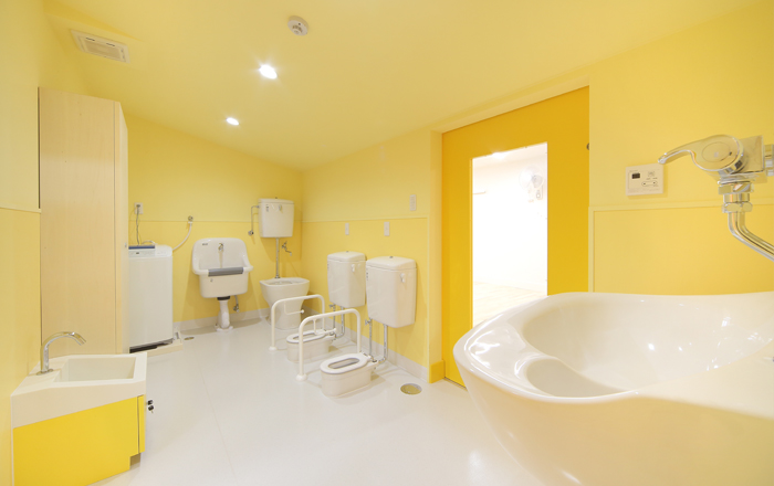 木造2階建て。大きな家型屋根の小さなコミュニティに山と谷のある集落のような空間を作った。色や形をコミュニケーションツールとし、上下左右と変化に富むシーンを展開した。
