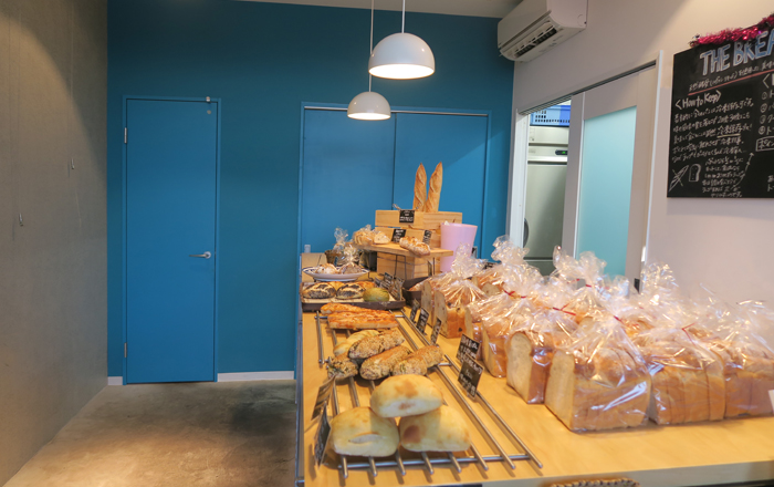 9.6坪の小さなベーカリー。ファサードと内装にオーナーこだわりのセルリアンブルーを配色。大きな木製カウンターに並べられたパンが通りから見える。