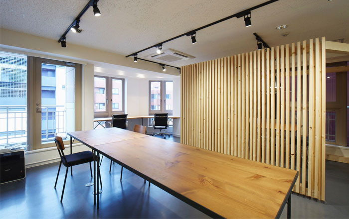 既存のオフィスビルの一室をリノベーション。限られたスペースに箱状のルーバーを配置することで空間を分け、それぞれに居心地のよいオフィス空間を作った。