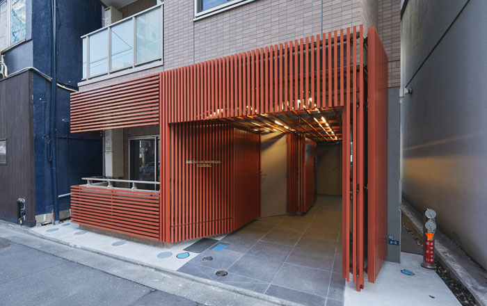 外壁は二丁掛けタイル、エントランス周りは300角の御影タイルといったあまり特徴のない外観だったため、エントランスまわりや軒下に外側から内側へ連続する錆色のルーバーを配し、人を迎え入れるマンションの顔を作る。