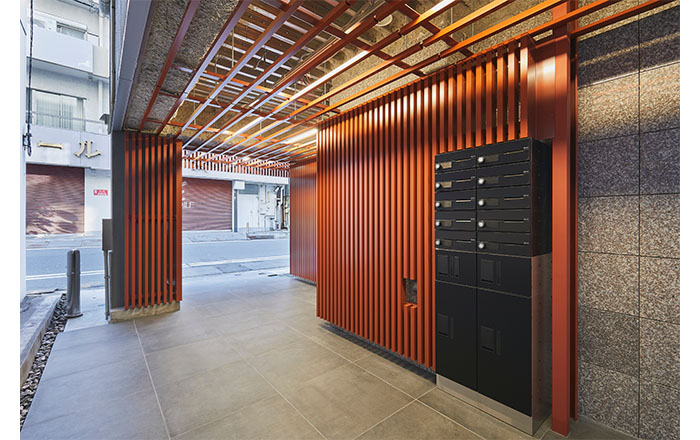 外壁は二丁掛けタイル、エントランス周りは300角の御影タイルといったあまり特徴のない外観だったため、エントランスまわりや軒下に外側から内側へ連続する錆色のルーバーを配し、人を迎え入れるマンションの顔を作る。